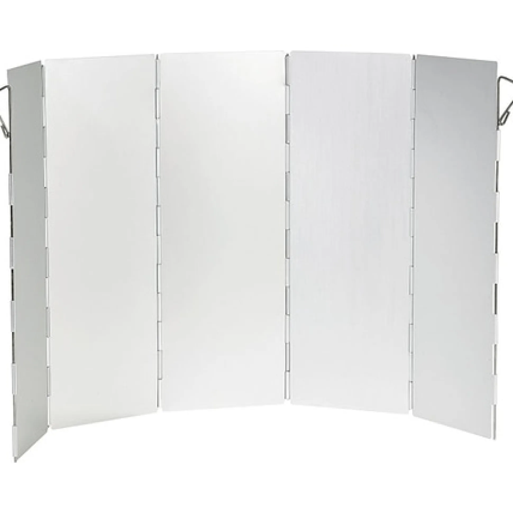 5fach faltbarer Aluwindschirm mit Stahlstiften im Boden fixierbar.