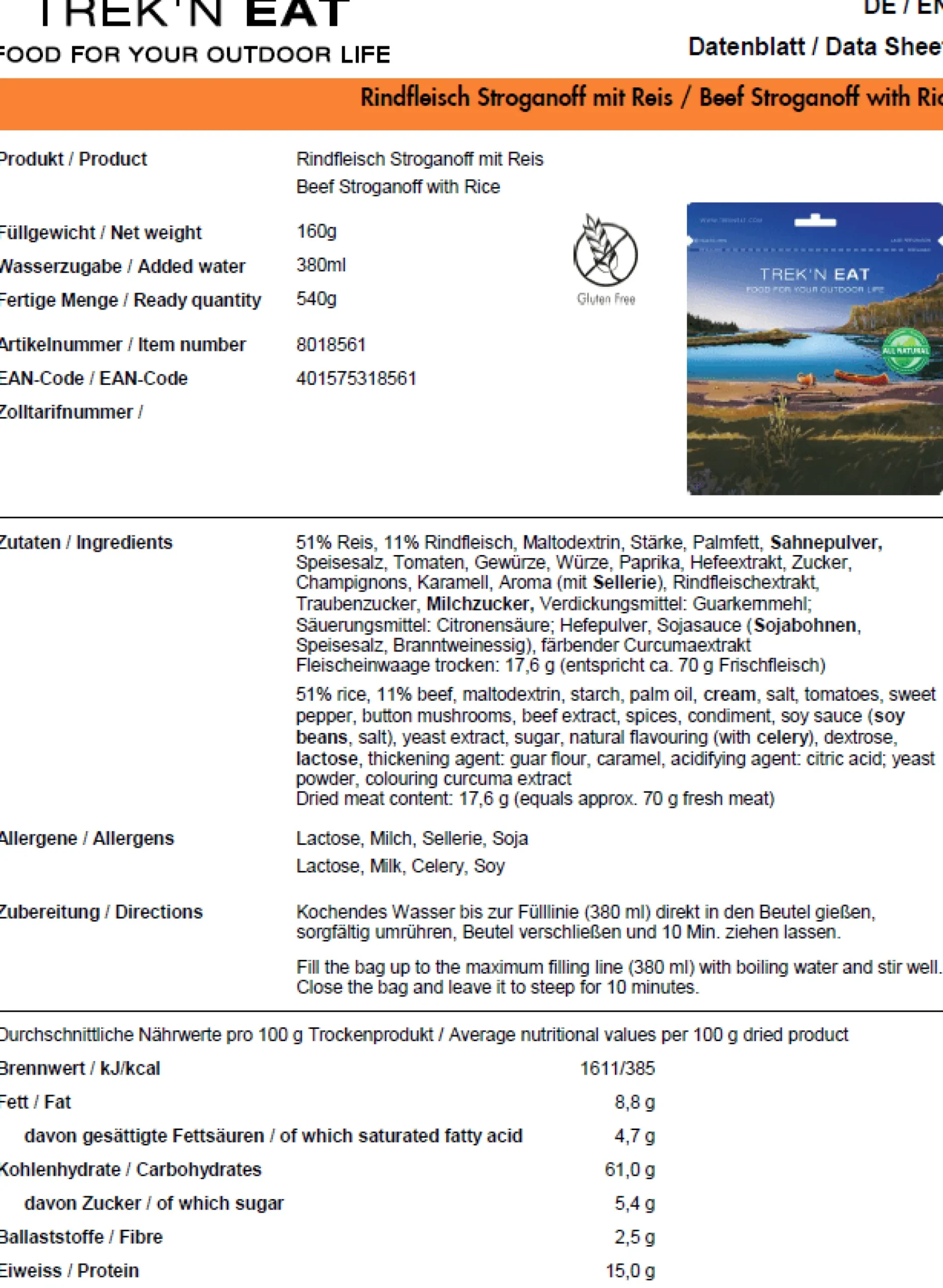 Trek’n Eat hat mit mit der Trekkingmahlzeit Rindfleisch Stroganoff mit Reis ein Leckerli für dich auf deinen Outdoortouren. Dieser Klassiker ist schonend dehydriert und ist damit natürlich auch sehr leicht. Für den Feinschmecker auf Trekkingtour oder im Lager beim Klettern ist das Rindfleisch Stroganoff mit Reis genau das richtige. Durch den Reis hast du auch mal Abwechlung und musst dich nicht nur von Nudeln ernähren.