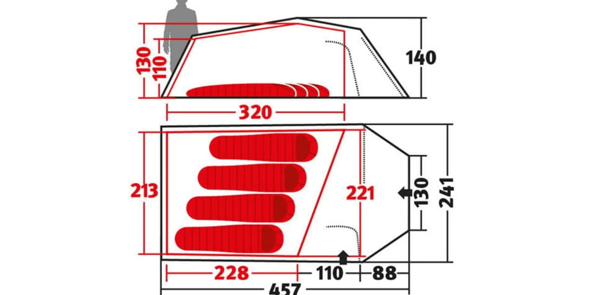 - Innenzeltgröße (LxBxH): 228/310 × 213 × 130 cm