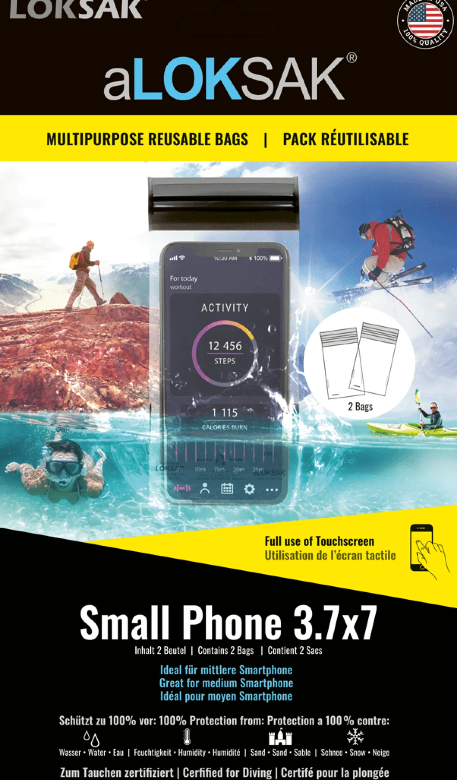 Der aLoksak 3.7 X 7 ist die perfekte Trockenzelle! Durch die fortschreitende Technik gibt es immer mehr Geräte, die man unterwegs oder im Alltag wasserdicht oder staubdicht schützen muss: Handy, Digitalkamera, Helmkamera, GPS, Tablet, MP3. In diesen Beuteln ist alles wasserdicht und staubdicht aufgehoben. Dank des patentierten Verschlusses lassen sich die Beutel immer wieder, ohne Einschränkungen, öffnen und schließen. Lebensmittelecht, luft- und wasserdicht bis 60 Meter.