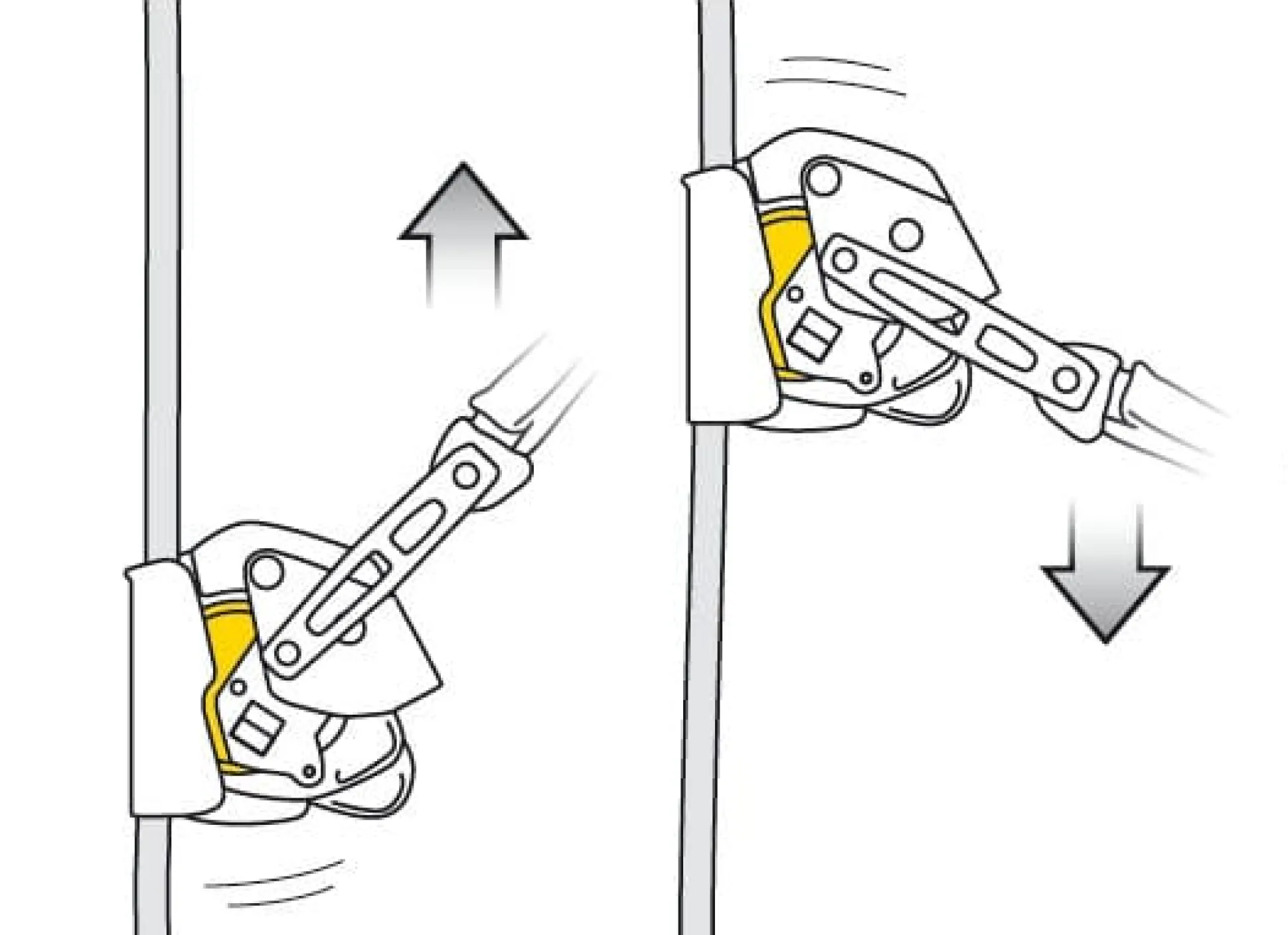 – Blockiert am Seil, auch wenn der Anwender während des Sturzes nach dem Gerät greift.