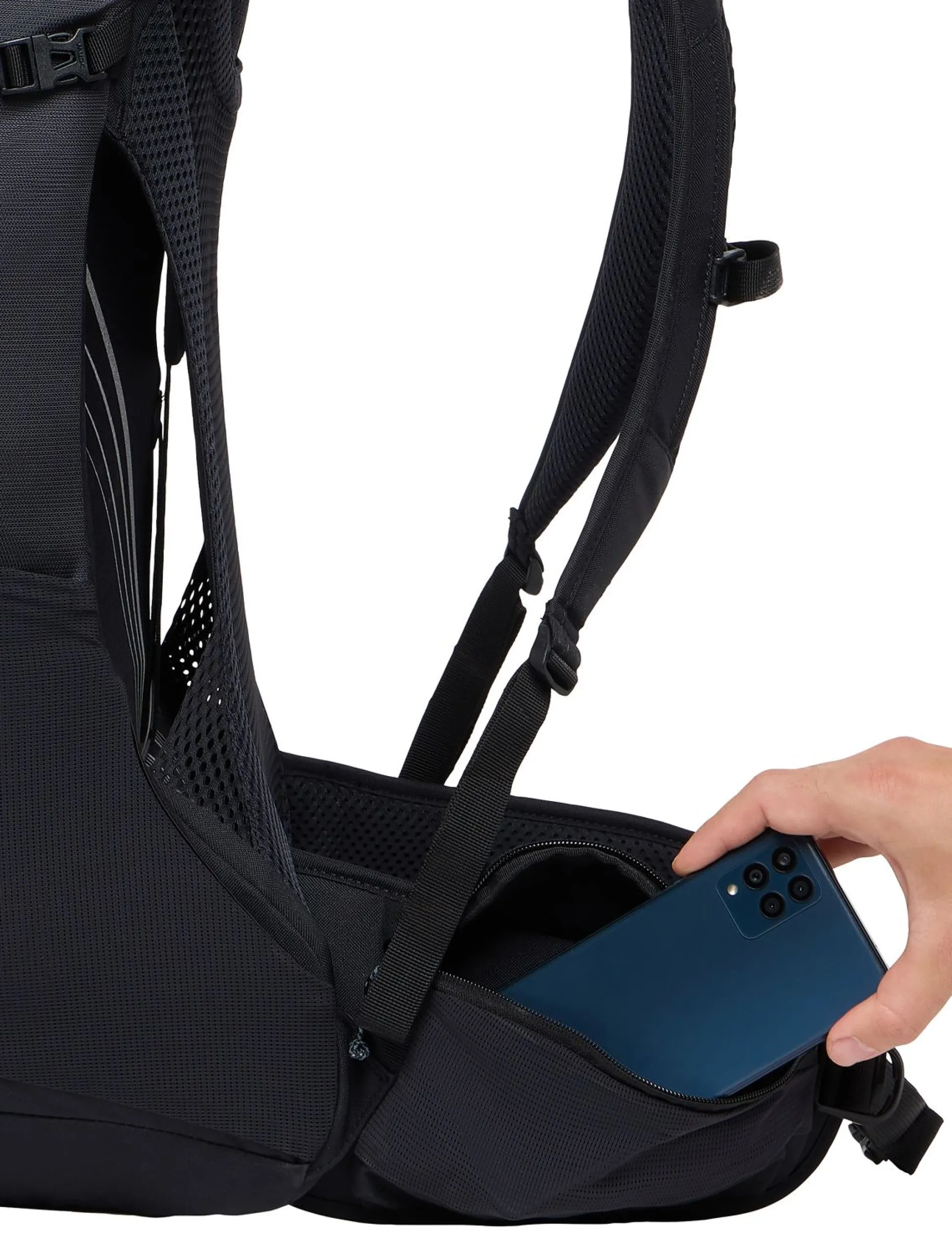 Die vollwertigen Hüftflossen (auf einer Seite mit smartphonekompatibler Reißverschluss-Tasche) sorgen für eine gute Lastübertragung und einen sicheren Sitz auch in ausgesetzten Passagen. Schnell mal an die Brotzeitdose ganz unten im Rucksack? Kein Problem dank des praktischen Frontzugriffs.