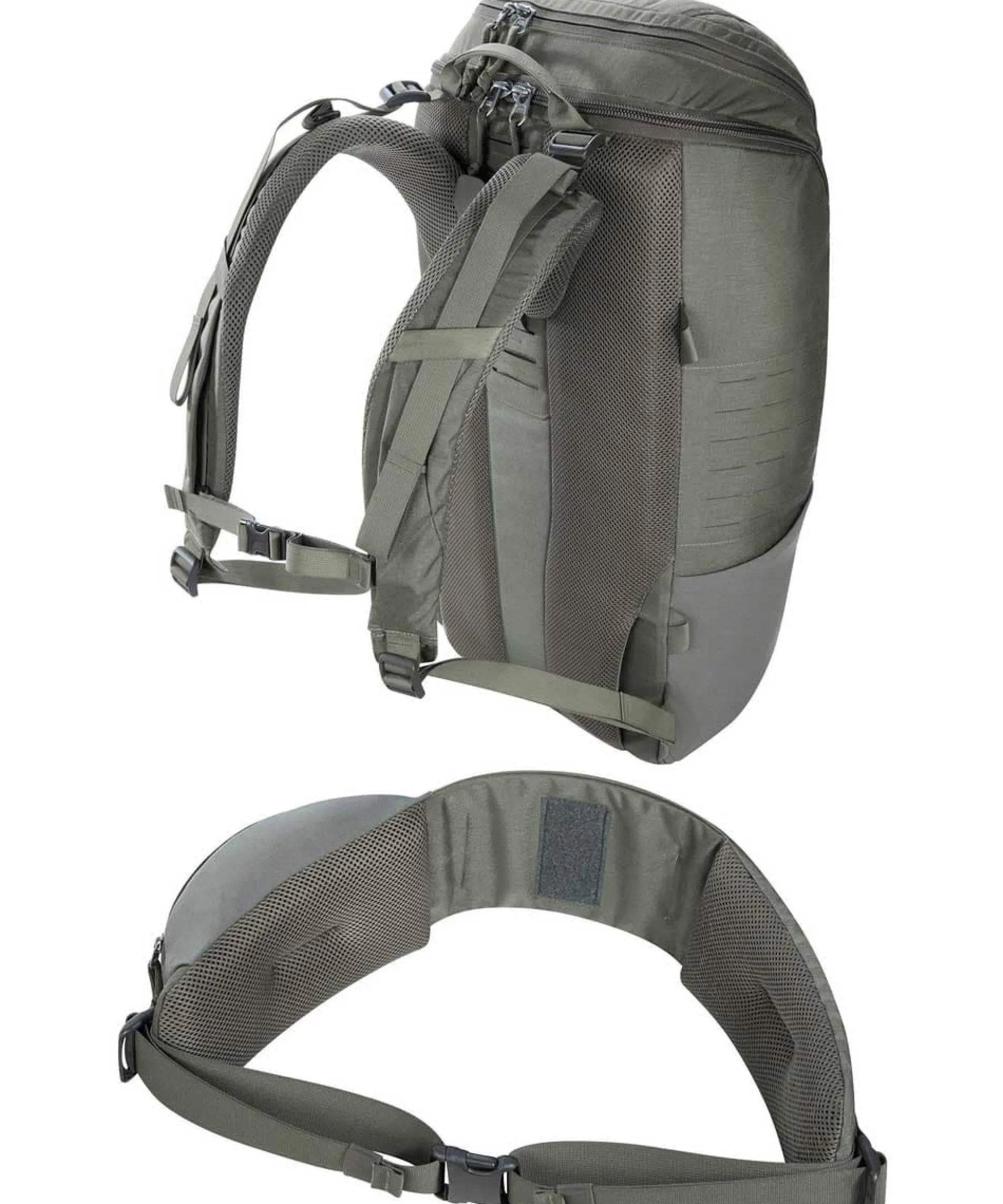 - Der Hüftgurt des Rucksacks ist auf der einen Seite mit einer Reißverschlusstasche und auf der anderen mit Matrialschlaufen ausgestattet. Du kannst ihn abnehmen und separat als Gürtel für deine Ausrüstung verwenden, wenn du einmal nicht soviel mitnehmen willst.