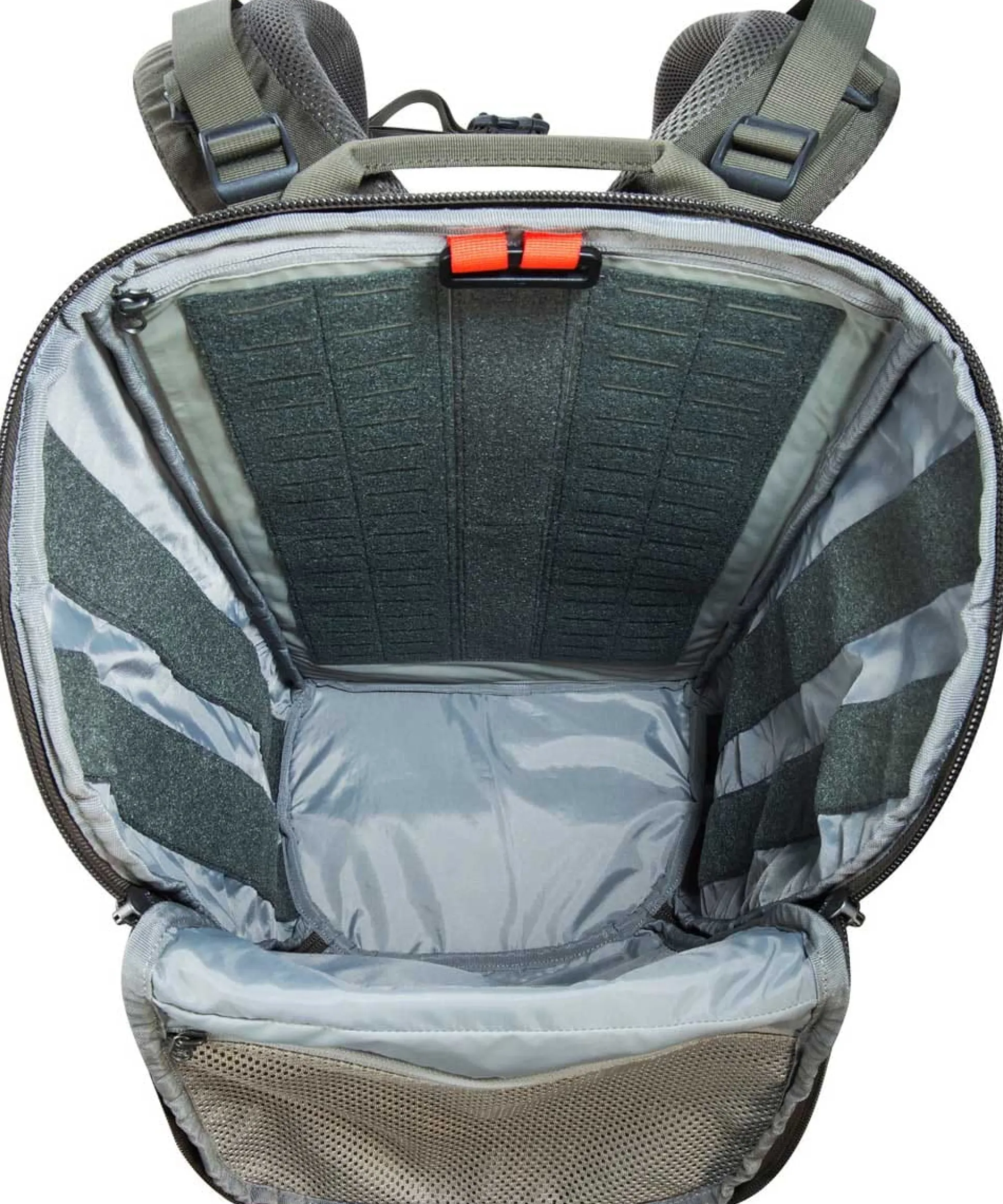 - An der Rückwand und an den Seiten befinden sich Flauschklett-Flächen, an die du Kleintaschen mit Hakenklett-Rückseite ganz einfach ankletten kannst. So ist dein Rucksack im Innern immer übersichtlich organisiert.