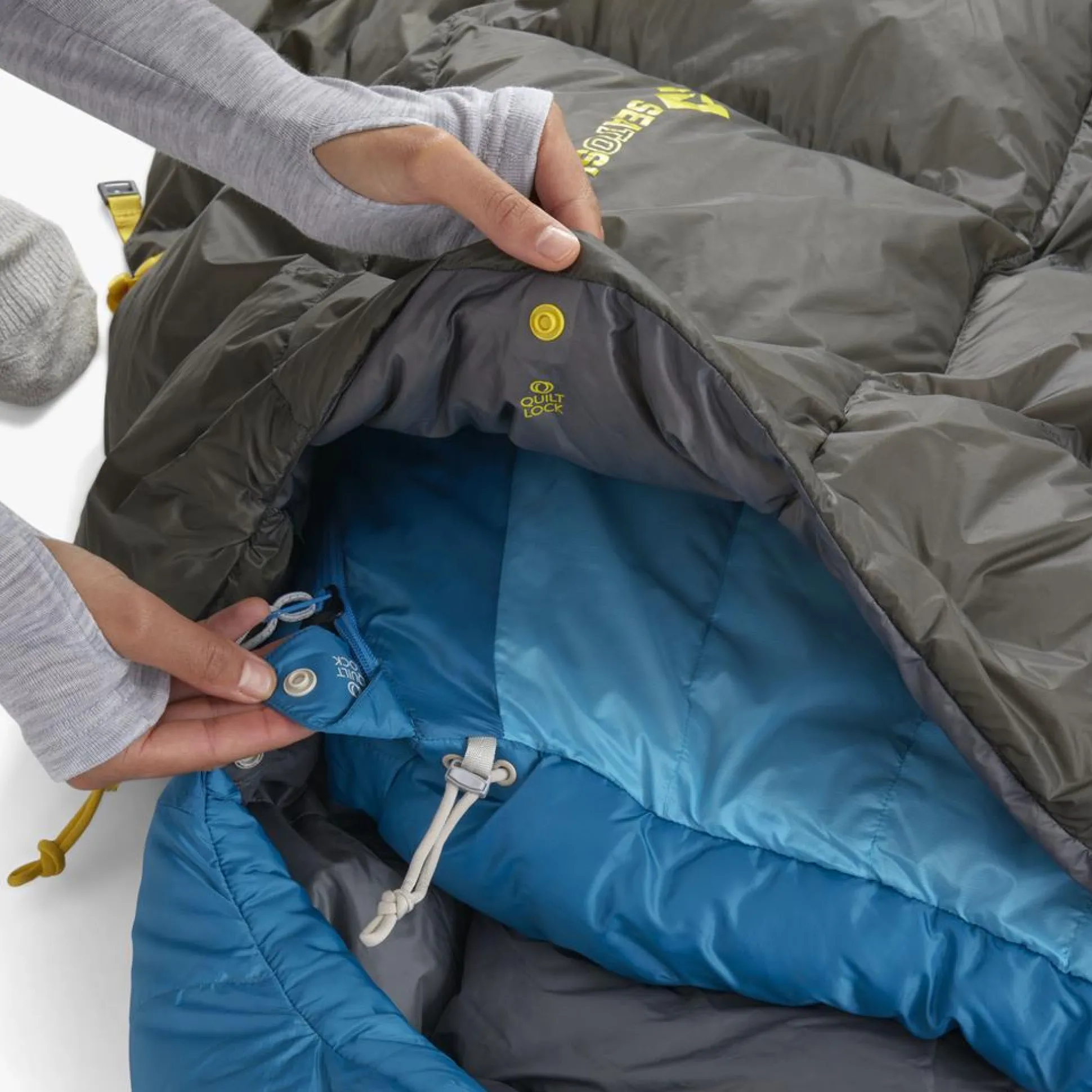 QUILT KOPPELBAR?: Kompatibel mit den meisten Sea to Summit Quilts. Zusätzliche Wärme: Beim QuiltLock System werden die Schnappverschlüsse an den Schultern der Sea to Summit Schlafsäcke und Quilts sowie die Fußbox mit Kordelzug verwendet, um einen Quilt am Schlafsack zu befestigen.