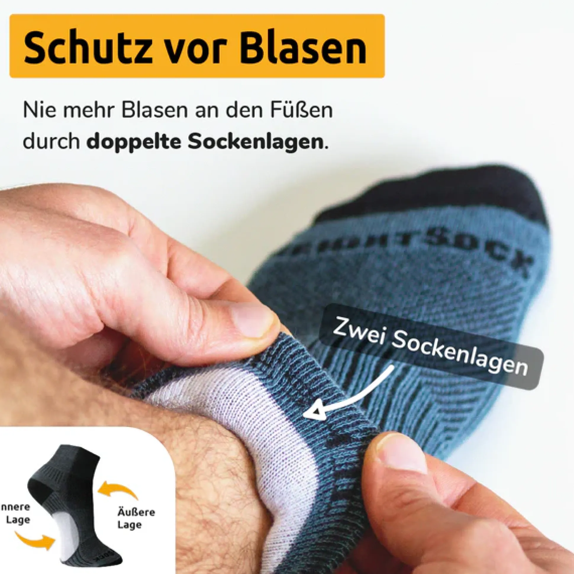- zweilagige Machart verhindert Reibung und somit Blasenbildung
