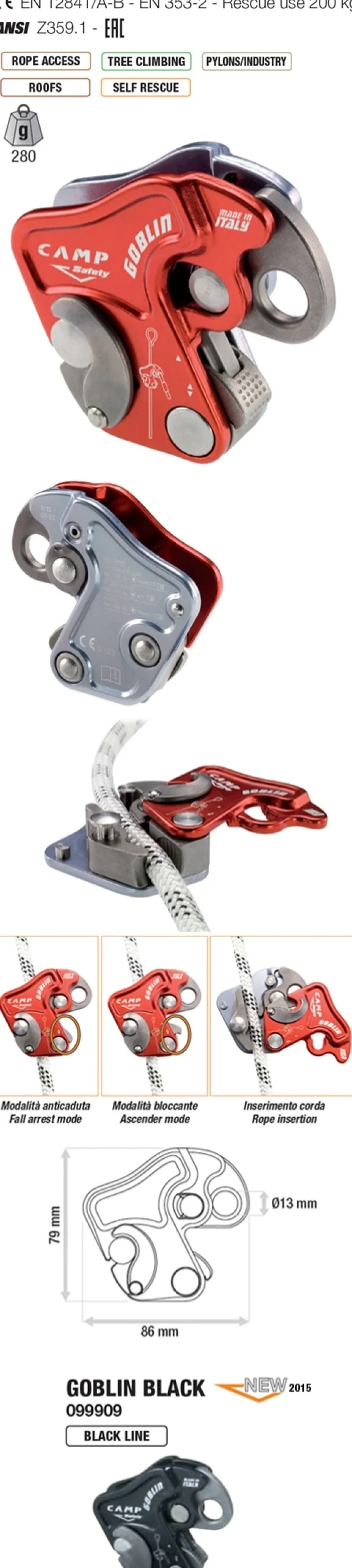 Das Goblin von Camp ist eine mitlaufende Absturzsicherung, welche sich für halbstatische Seile mit Seildurchmesser von 10 bis 11 mm eignet.