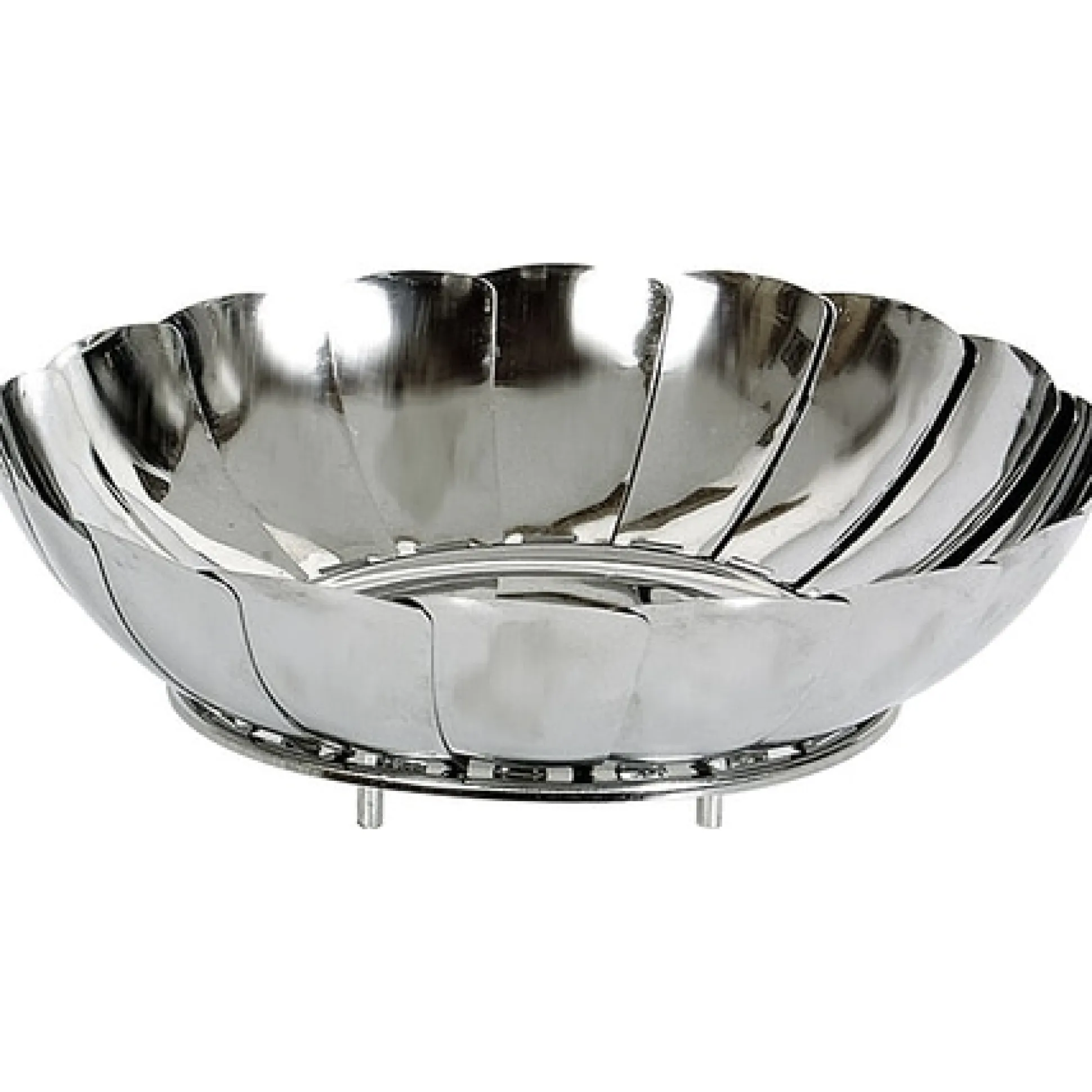 Aus 18 beweglichen Lamellen bestehende Feuerschale aus Edelstahl.