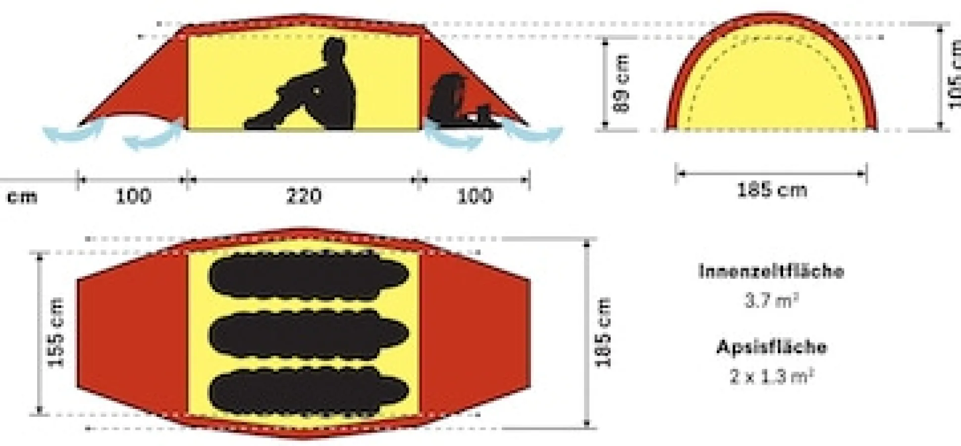- Bietet reichlich Platz für drei Personen mit Ausrüstung.