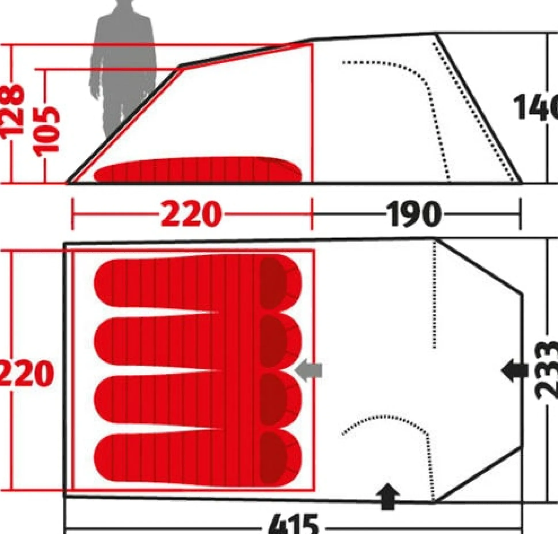 Es hat drei durchgehende aussenliegende Flachkanäle. Diese sind gut zu handhaben, bieten kaum Windwiderstand und minimieren so die Windgeräusche. Durch die besondere, steile Form des Vorzeltes kann man darunter gut sitzen und die gesamte Fläche nutzen.