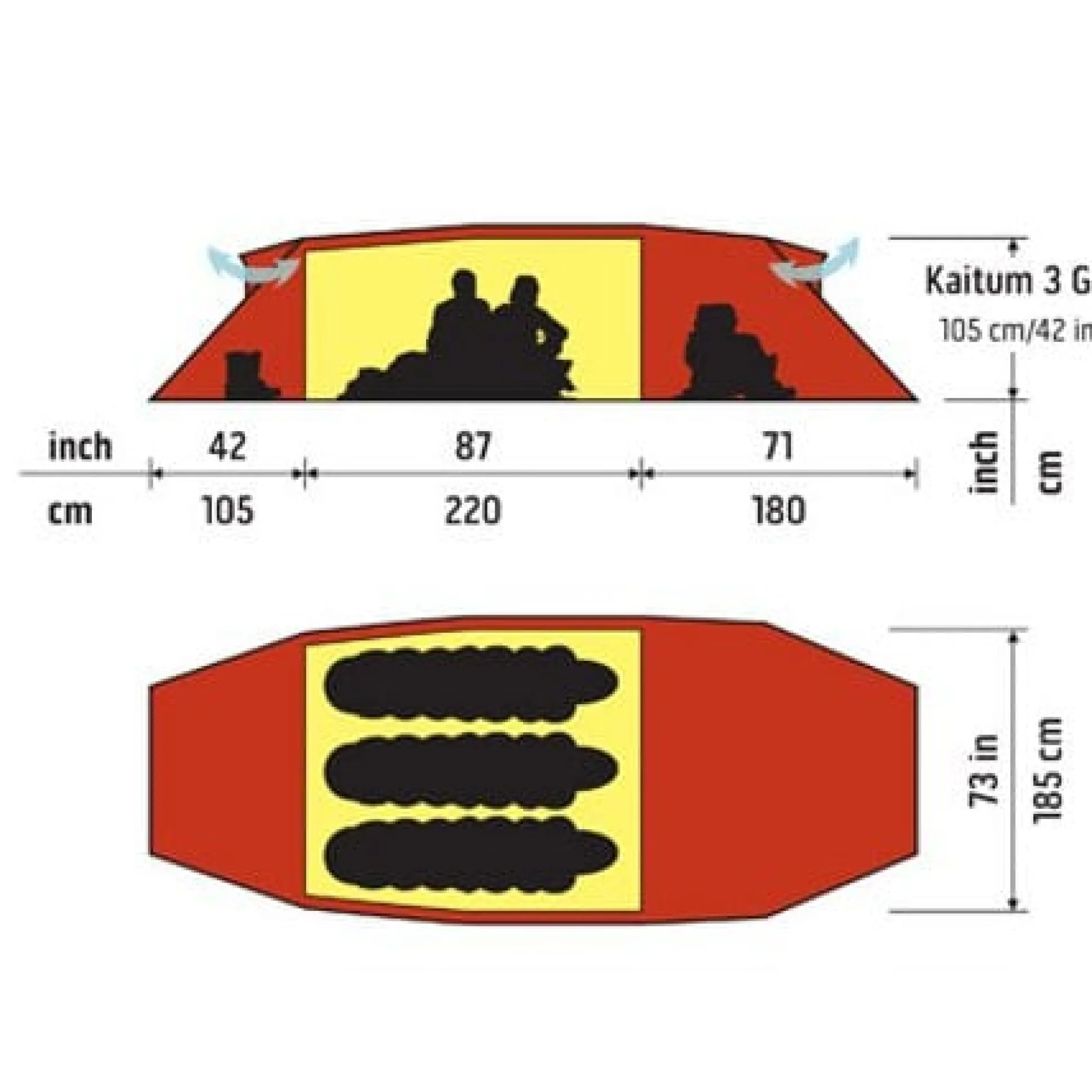 Die Maße des Innenzeltes von 220 cm Länge, 185 cm Breite und 105 cm Höhe bietet 2 – 3 Personen einen komfortablen Schlafplatz und eine angenehme Sitzhöhe. Für eine ausreichende Belüftung können die großen Lüfter, die sich jeweils an den Apsiden befinden, geöffnet oder verschlossen werden. 4 Taschen im Innenzelt nehmen alle wichtigen Utensilien auf, die schnell zur Hand sein sollen.