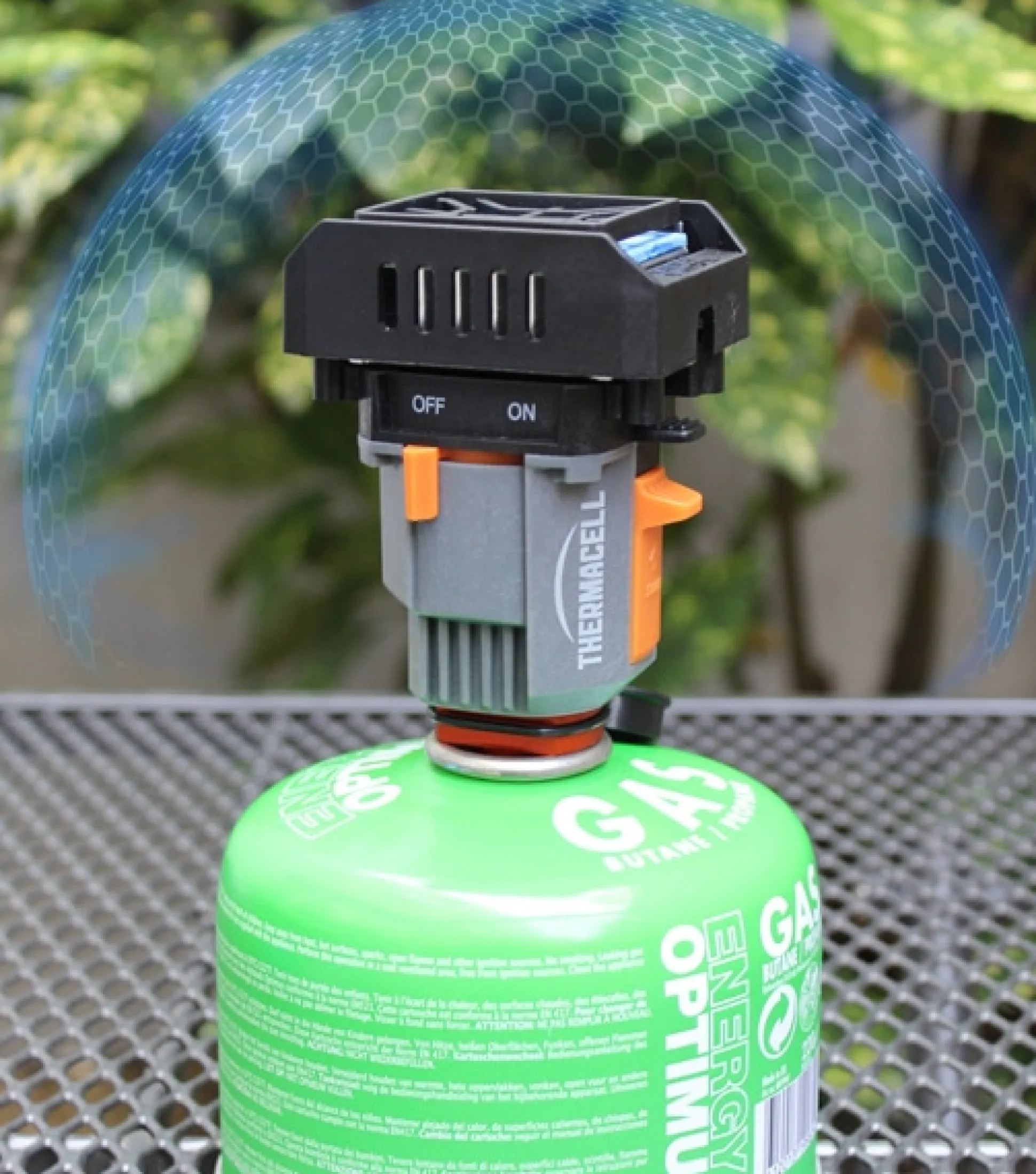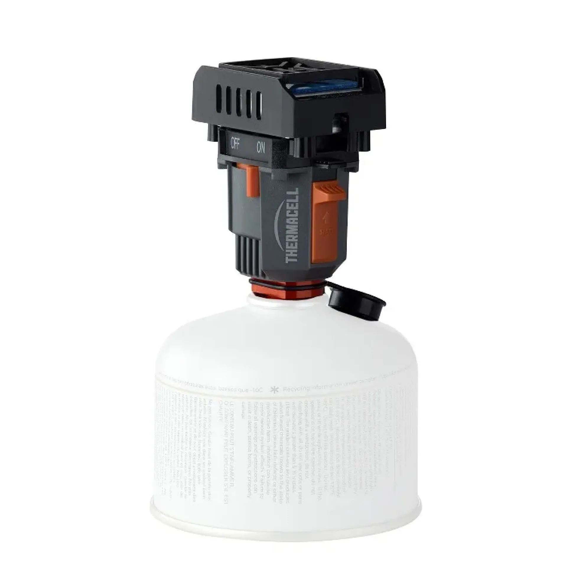 Die THERMACELL®-Wirkstoffplättchen aus der Schutzhülle nehmen und unter das Gitter einschieben. Campinggaskartusche einschrauben und das Gerät einschalten. Ein Wirkstoffplättchen reicht für 4 Stunden.