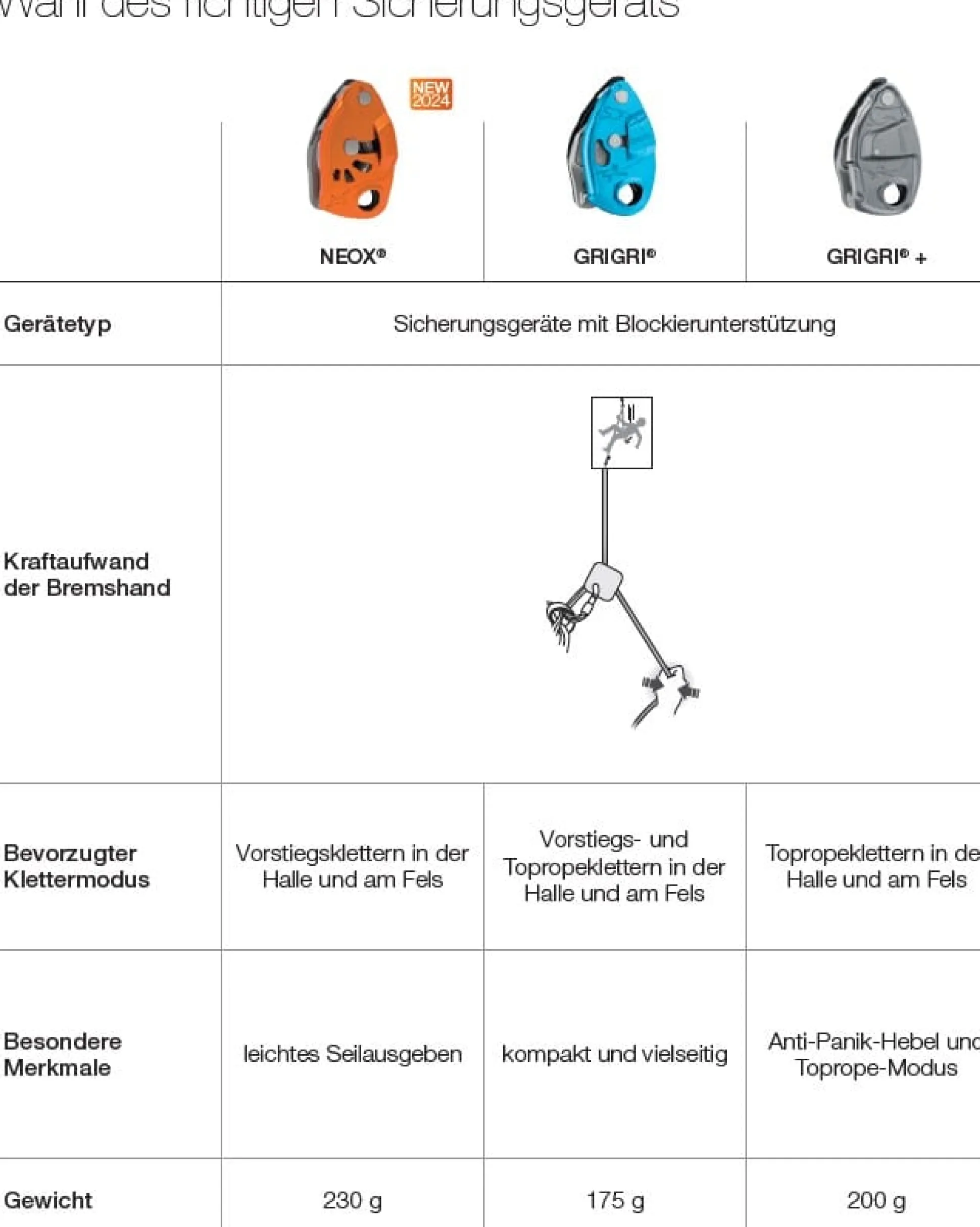 - gleiche Handgriffe wie bei allen Petzl- Sicherungsgeräten: Das Seil wird in das Gerät geführt und eine Hand befindet sich immer am Bremsseil