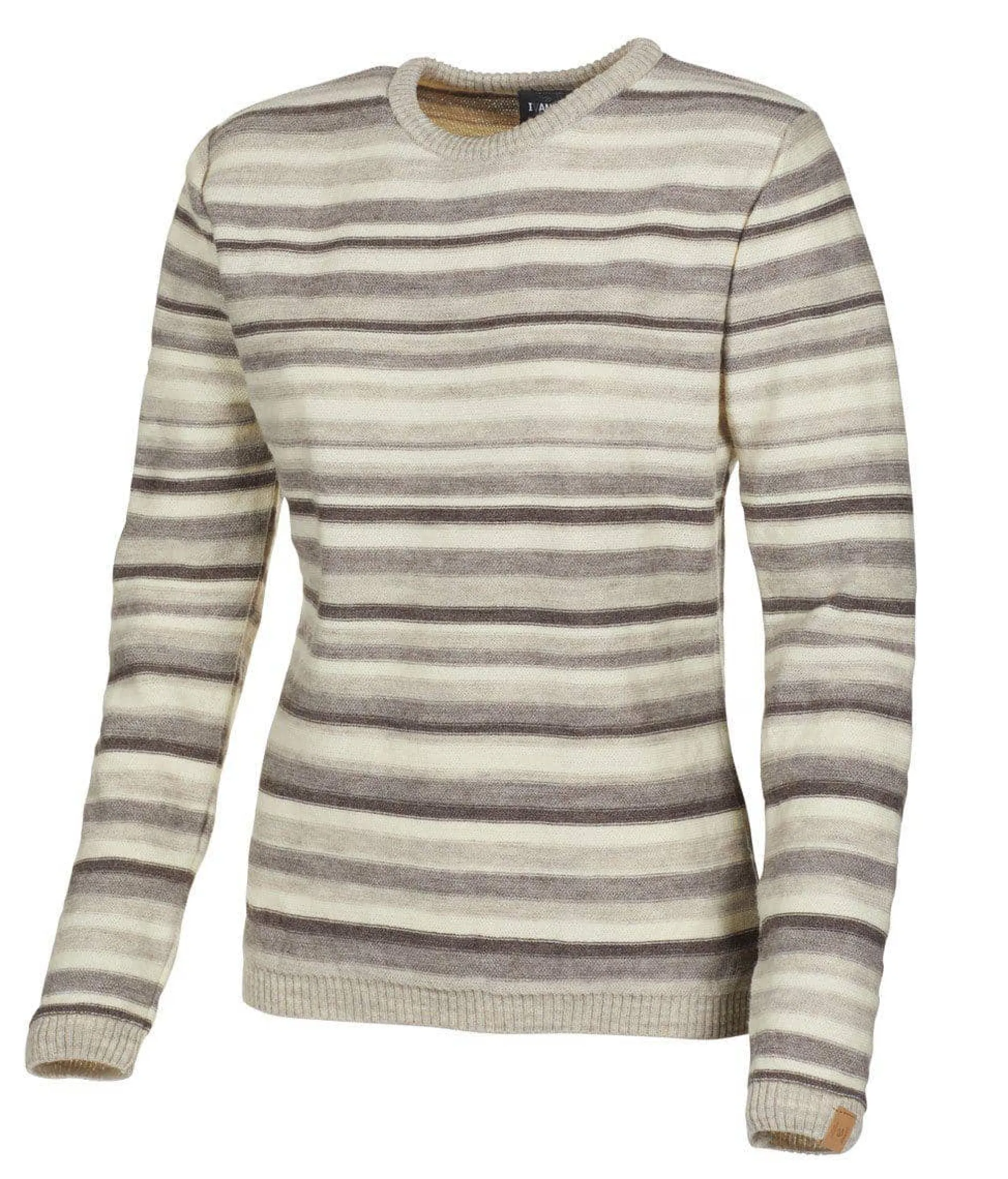 Fünf verschiedene Naturfarben werden zu harmonischen Streifenvarianten kombiniert. Rippstrickbündchen am Körper und an den Armen sowie ein dünner Rippstrickkragen. Kleines Logo-Emblem aus Jacron unten am linken Arm.