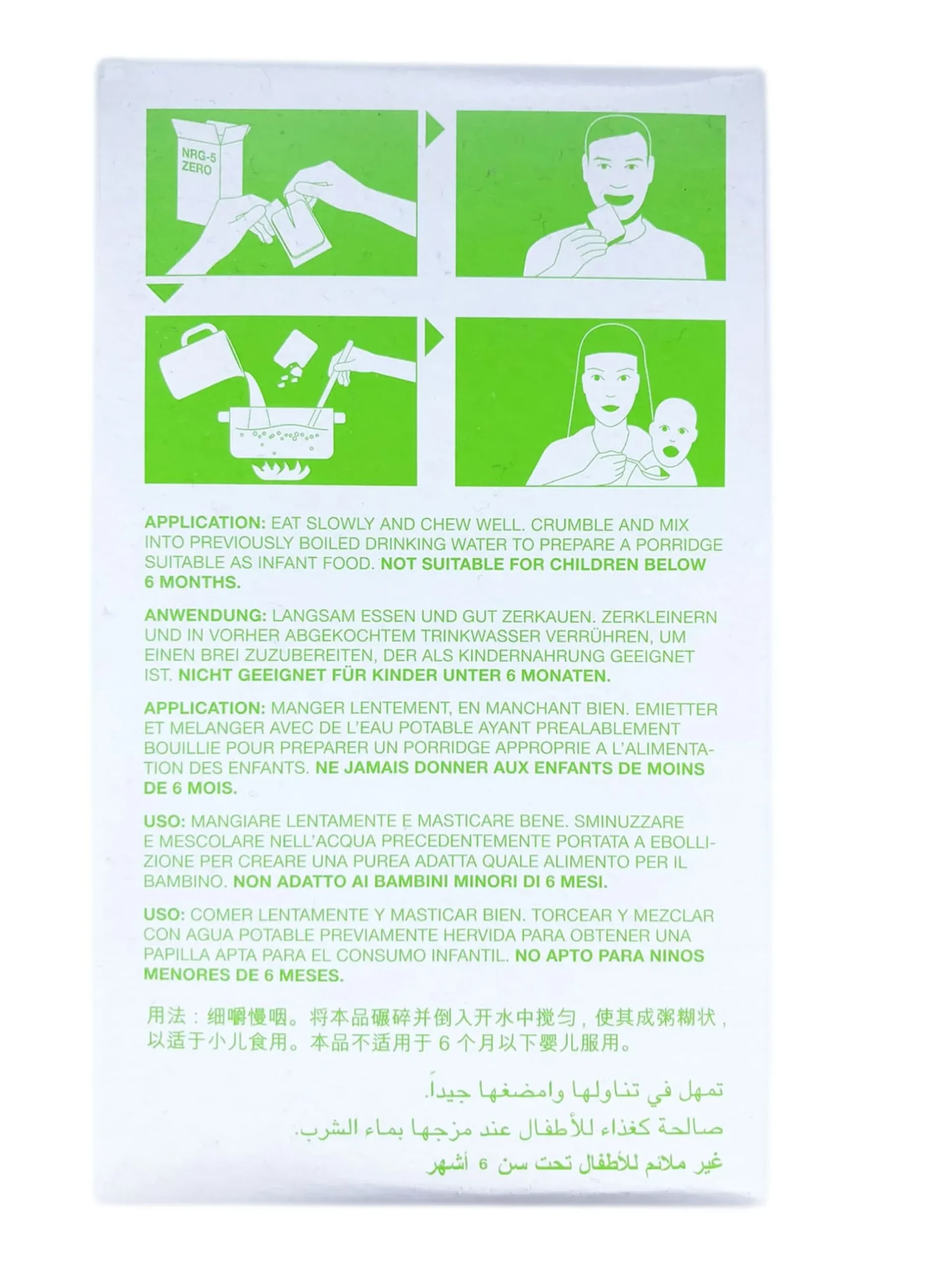 Eine Packung NRG-5 ZERO (500g / 2325 kcal) deckt den Tagesenergiebedarf eines Erwachsenen. Sofort verzehrbar, kein Erhitzen oder Kochen notwendig. Zerkleinert man den Riegel und fügt Wasser hinzu kann ein nahrhafter Brei oder je nach Zugabe der Wassermenge ein Energy Drink zubereitet werden.