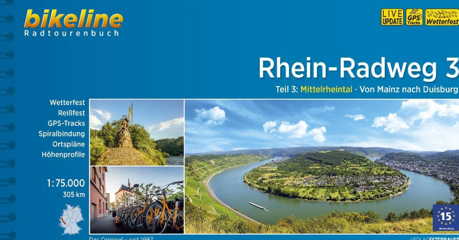 Das UNESCO-Weltkulturerbe Oberes Mittelrheintal lässt sich auch mit dem Fahrrad erkunden. Der Radweg führt immer am Rhein entlang, der ein Durchbruchstal durch das Rheinische Schiefergebirge geformt hat. Vorbei an Weinbergen, über 40 Burgen und dem bekannten Loreleyfelsen erreichen Sie das sehenswerte Koblenz. Auch das Untere Mittelrheintal nördlich von Koblenz bietet einige kulturelle und landschaftliche Höhepunkte. Ab der früheren Bundeshauptstadt Bonn weitet sich das Rheintal dann zur Kölner Bucht, der Mittelrhein wird zum Niederrhein. Zwischen dem Kölner Dom und den Duisburger Hochöfen erwartet Sie eine abwechslungsreiche Etappe mit viel Kultur, viel Industrie und überraschend viel Natur. Ein Höhepunkt auf dem letzten Abschnitt ist die Landeshauptstadt Düsseldorf mit ihren zahlreichen Kultureinrichtungen und der Altstadt, bekannt als “die längste Theke der Welt”.
