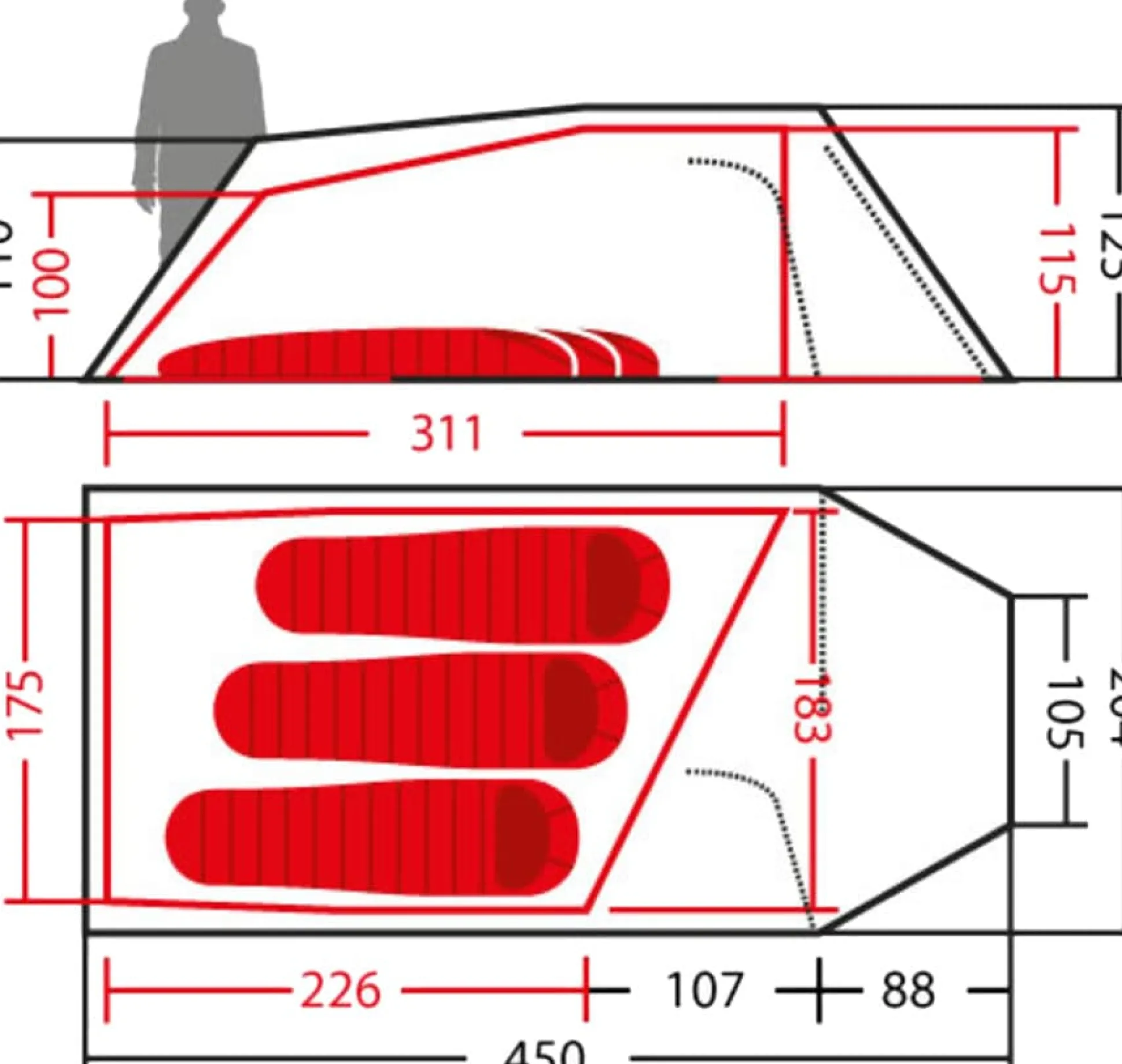Beim Tempest finden dank asymmetrischem Innenzelt auch die ganz langen Kerls Platz, oder eben zusätzliches Gepäck, der Hund,ein Kleinkind, die Briefmarkensammlung,…