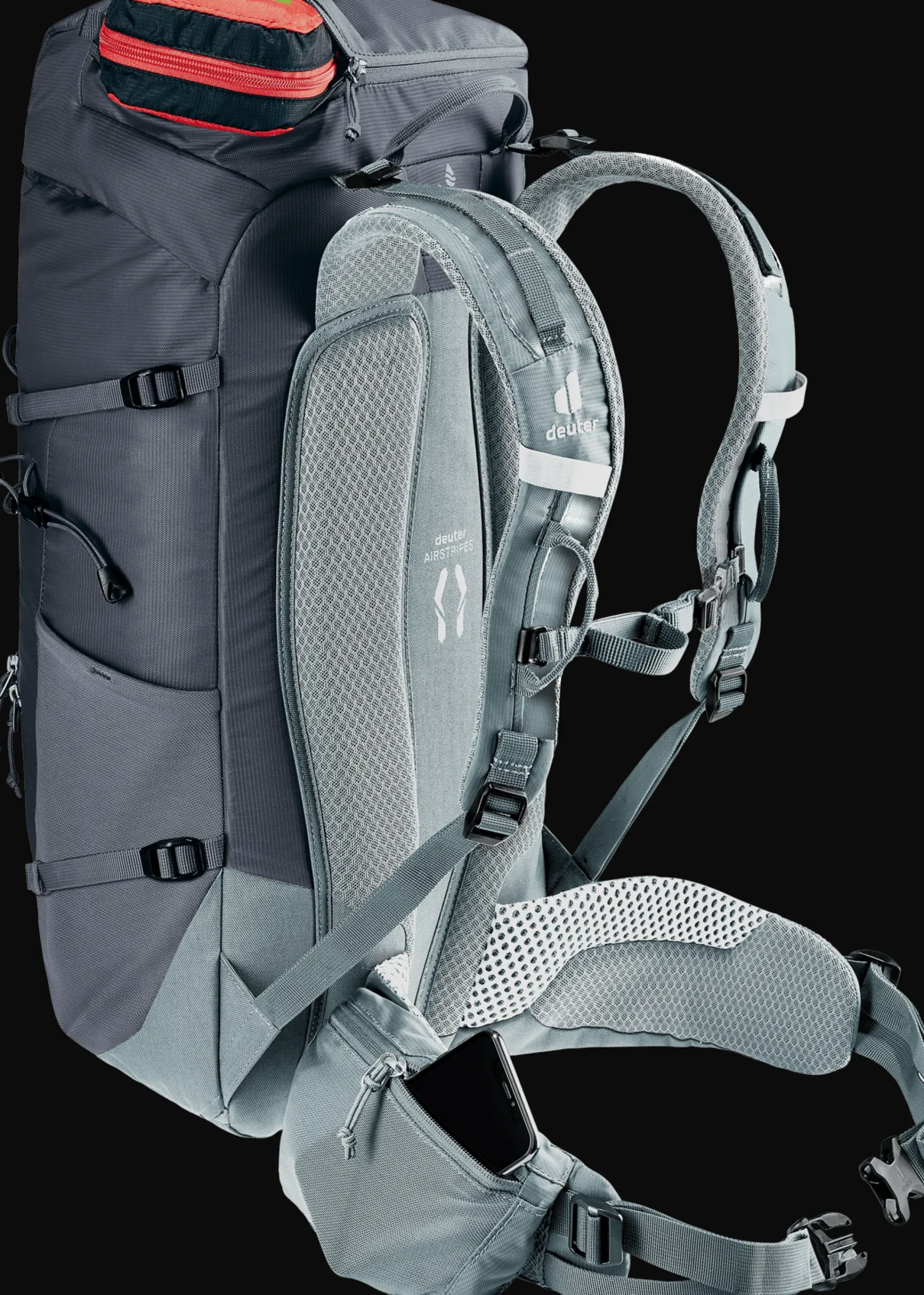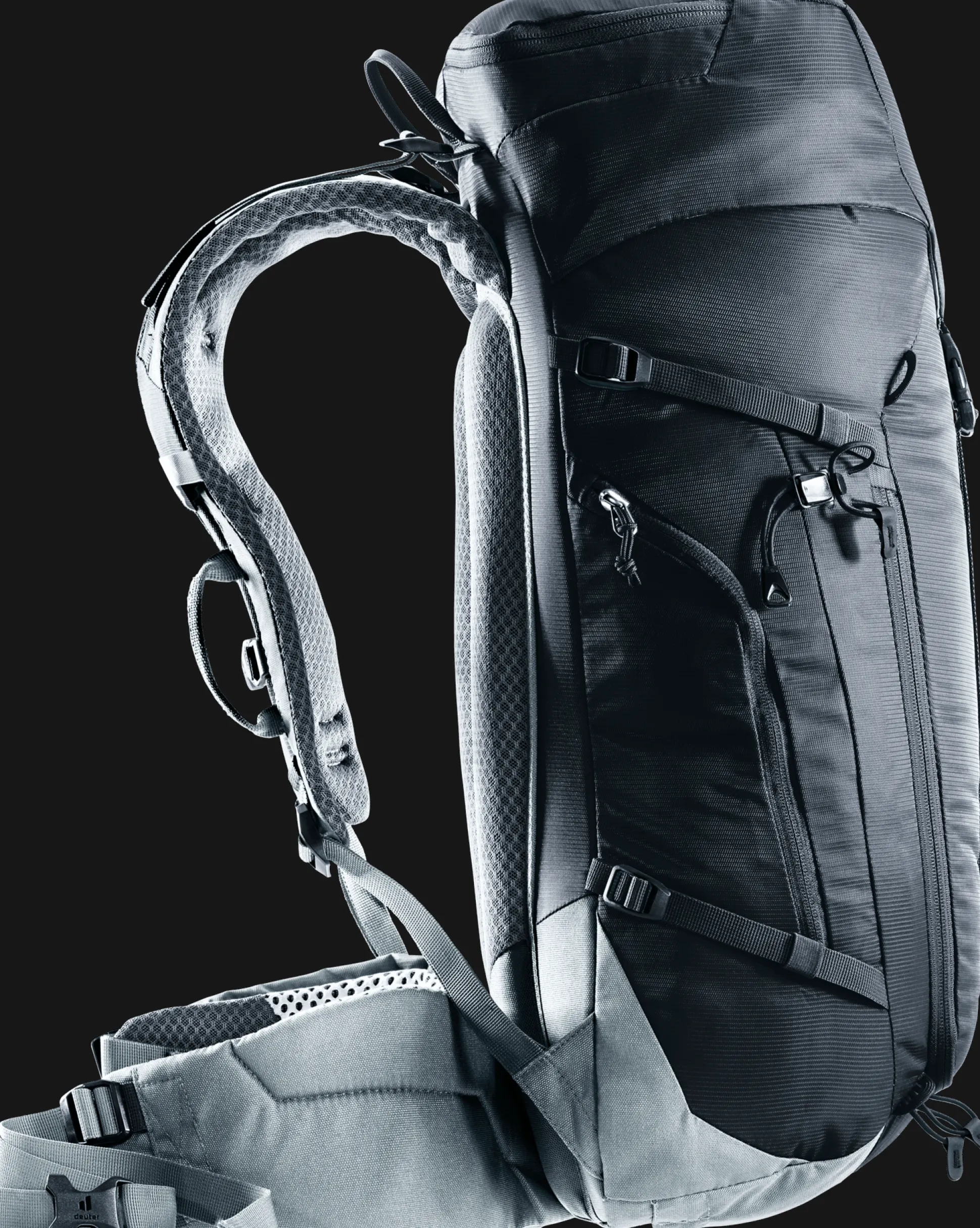Das Airstripes Rückensystem mit geringer Rückenauflage und großen Belüftungskanälen sorgt für optimale Luftzirkulation, die perforierten Schulterträger und Hüftflossen mit Taschen für körpernahe Gewichtsverteilung und damit einen kompakten Sitz in jedem Terrain. Die flache Deckelkonstruktion bietet gute Kopffreiheit – auch mit Helm. Dank Fixierungen an den Schulterträgern sind die Karabiner des Klettersteigsets stets griffbereit. Zudem sind Equipment und Material dank großem Reißverschluss-Frontzugang und Seitentaschen schnell zur Hand.