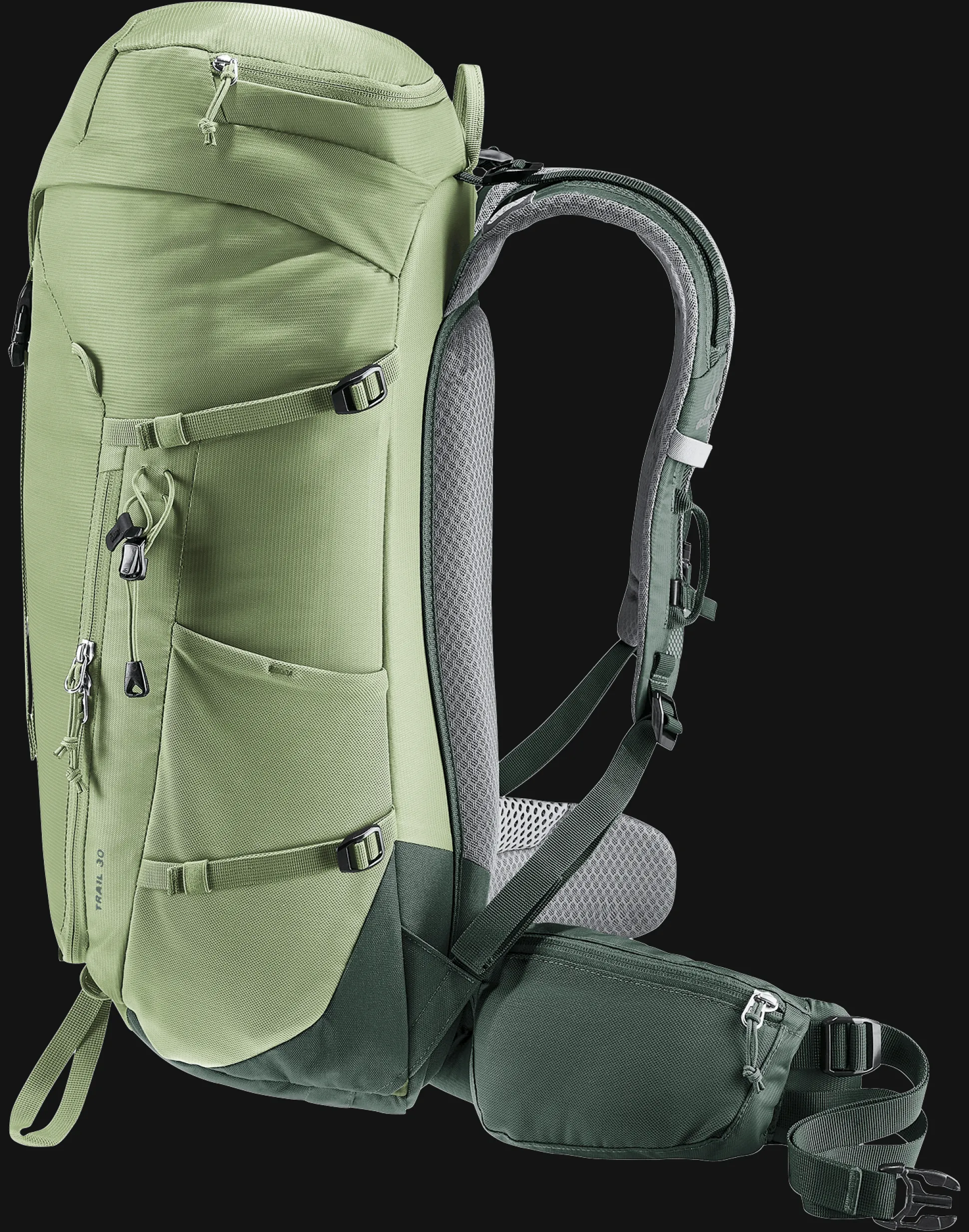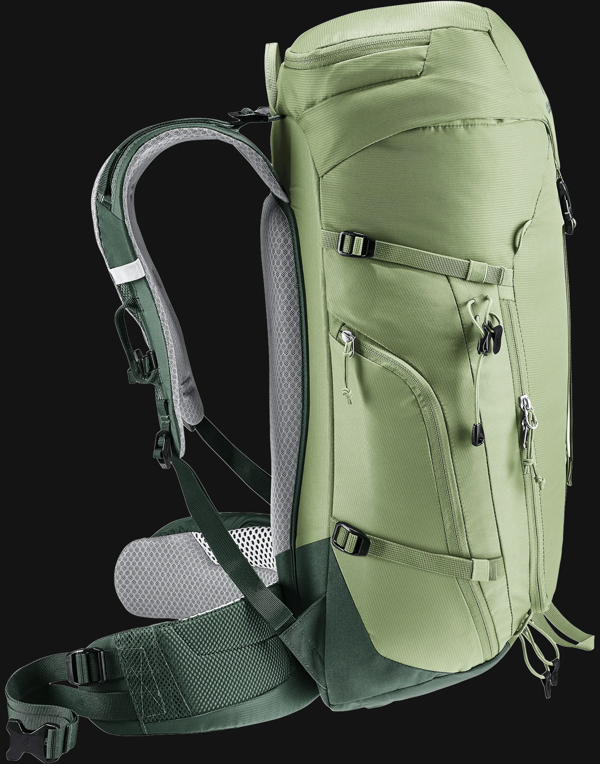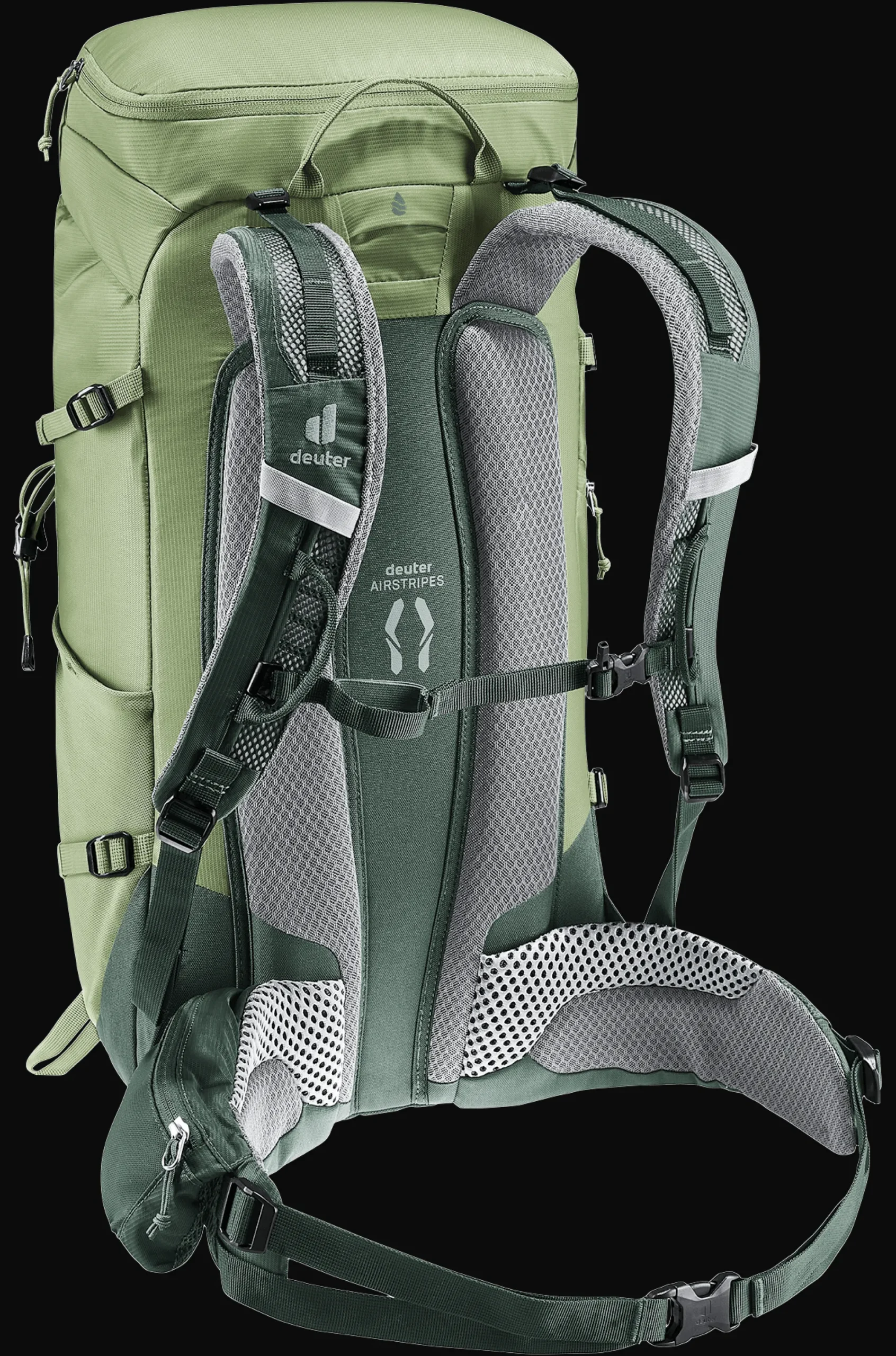 Das Airstripes Rückensystem mit geringer Rückenauflage und großen Belüftungskanälen sorgt für optimale Luftzirkulation, die perforierten Schulterträger und Hüftflossen mit Taschen für körpernahe Gewichtsverteilung und damit einen kompakten Sitz in jedem Terrain. Die flache Deckelkonstruktion bietet gute Kopffreiheit – auch mit Helm. Dank Fixierungen an den Schulterträgern sind die Karabiner des Klettersteigsets stets griffbereit. Zudem sind Equipment und Material dank großem Reißverschluss-Frontzugang und Seitentaschen schnell zur Hand.